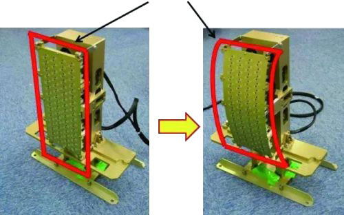 日本研制的這種天線上附有傳感器,可以檢測天線的彎曲曲率,通過計算曲率半徑得出各個元件的坐標,然后自動調整各個元件的相位,形成指定方向的電磁波束。防衛技術本部在微波暗室中對彎曲狀態的柔性共形陣天線的增益效果進行了驗證,確認在指定方向上形成了電磁波束,證明柔性共形陣天線對電磁波進行修正是有效的。